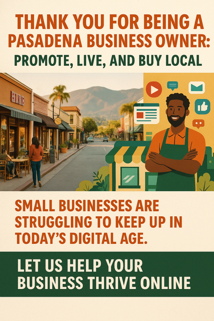 Thank you flyer for Pasadena business owners featuring a vibrant street scene with local shops and a smiling shop owner. The text reads: 'Thank you for being a Pasadena business owner: Promote, Live, and Buy Local.' It emphasizes the struggles of small businesses in the digital age with a call to action: 'Let us help your business thrive online